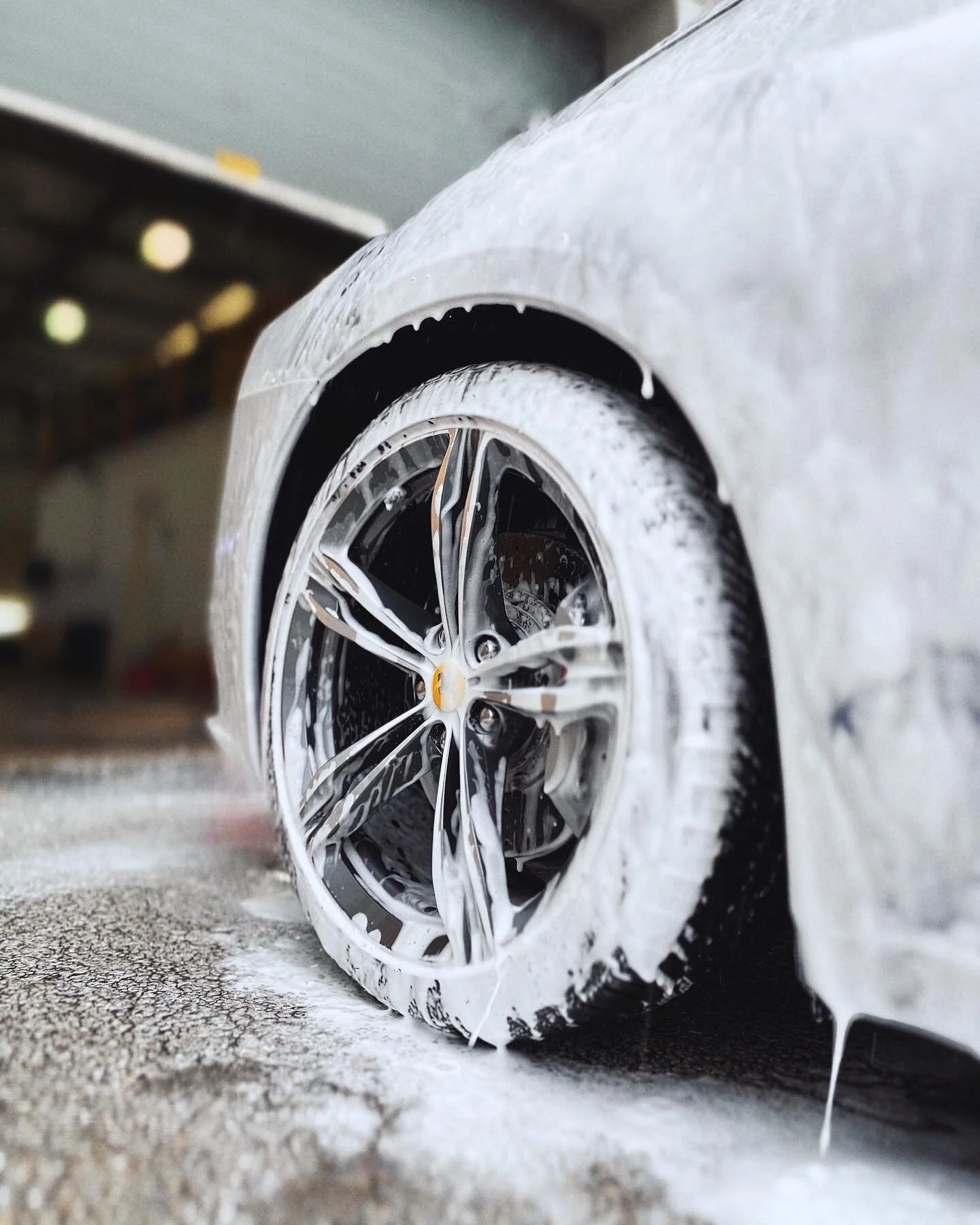 Pre-wash stage: we clean the wheels using various detailing brushes & Signature Non-Acidic Wheel Cleaner. We then make sure the entire body of the vehicle is given a thorough rinse to remove any loose contamination.